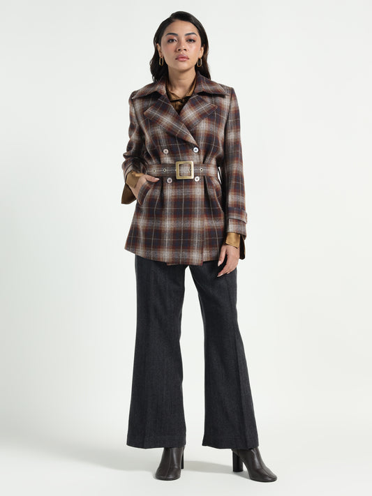 Cropped Trench Coat Ladakh Wool Brown Tartan
