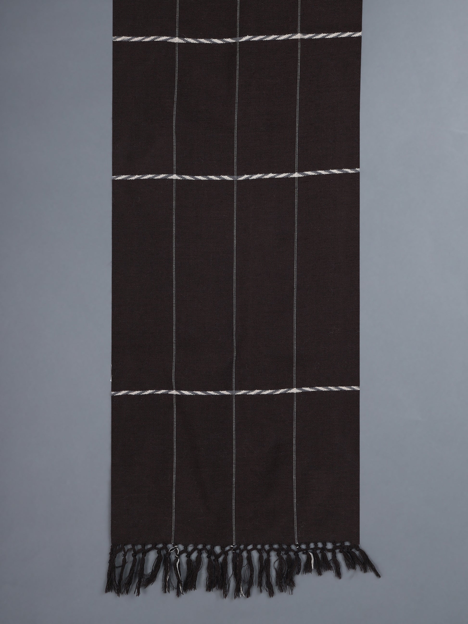Handwoven, indigenous Himalayan wool scarf in a dark chocolate brown colour (dyed using azo free, acid dyes). The border design is inspired by Changpa nomadic weaves. It has been executed in a plain tapestry weave technique, and using yarns dyed in azo free, acid dyes.
