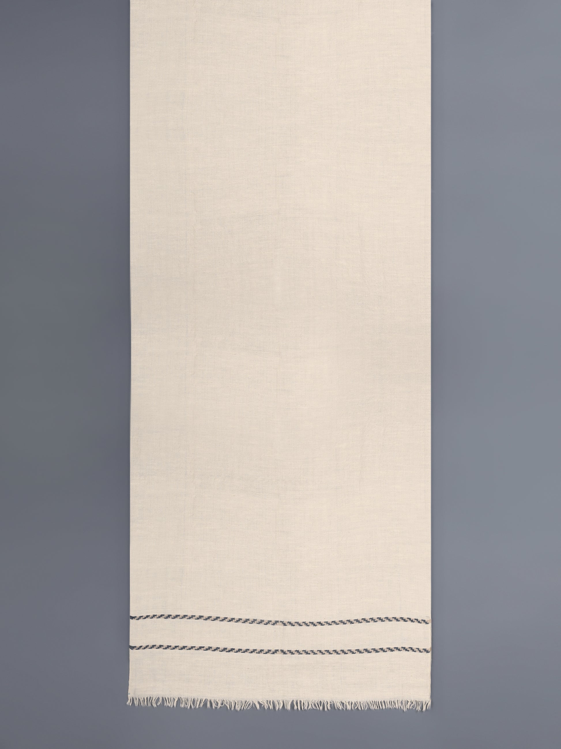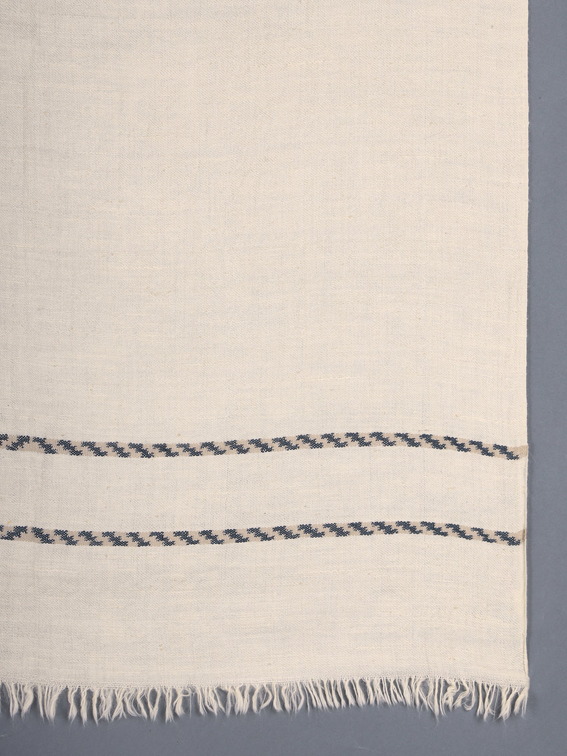 Handwoven Pashmina stole in natural white colour. The border design is inspired by Changpa nomadic weaves. It has been executed in a plain tapestry weave technique, and using yarns dyed in azo free, acid dyes.
