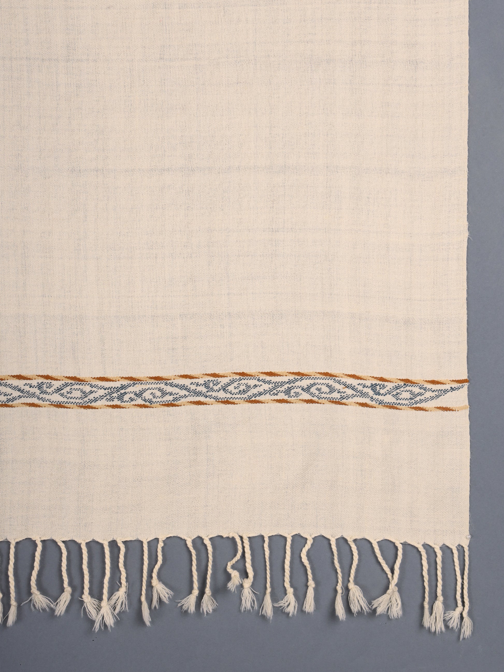 Handwoven, indigenous Himalayan wool stole in ivory white colour. The border design is inspired by Ladakhi clouds. It has been executed in an extra-weft Jamdani weave technique, and using yarns dyed in azo free, acid dyes.