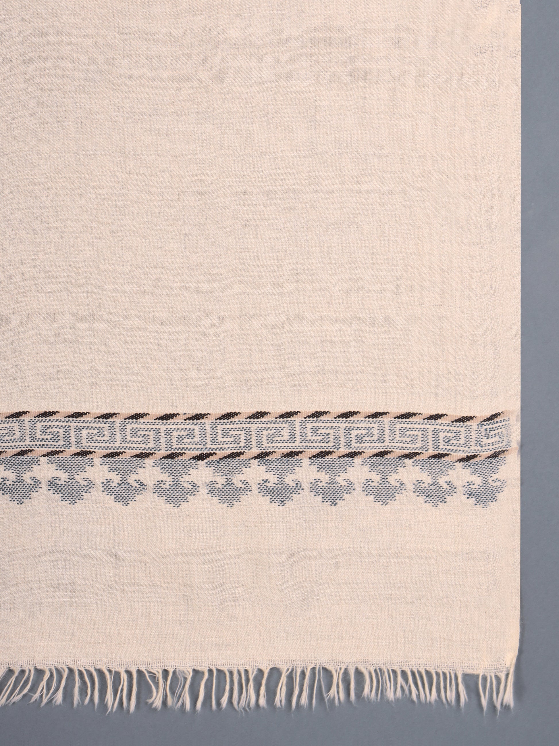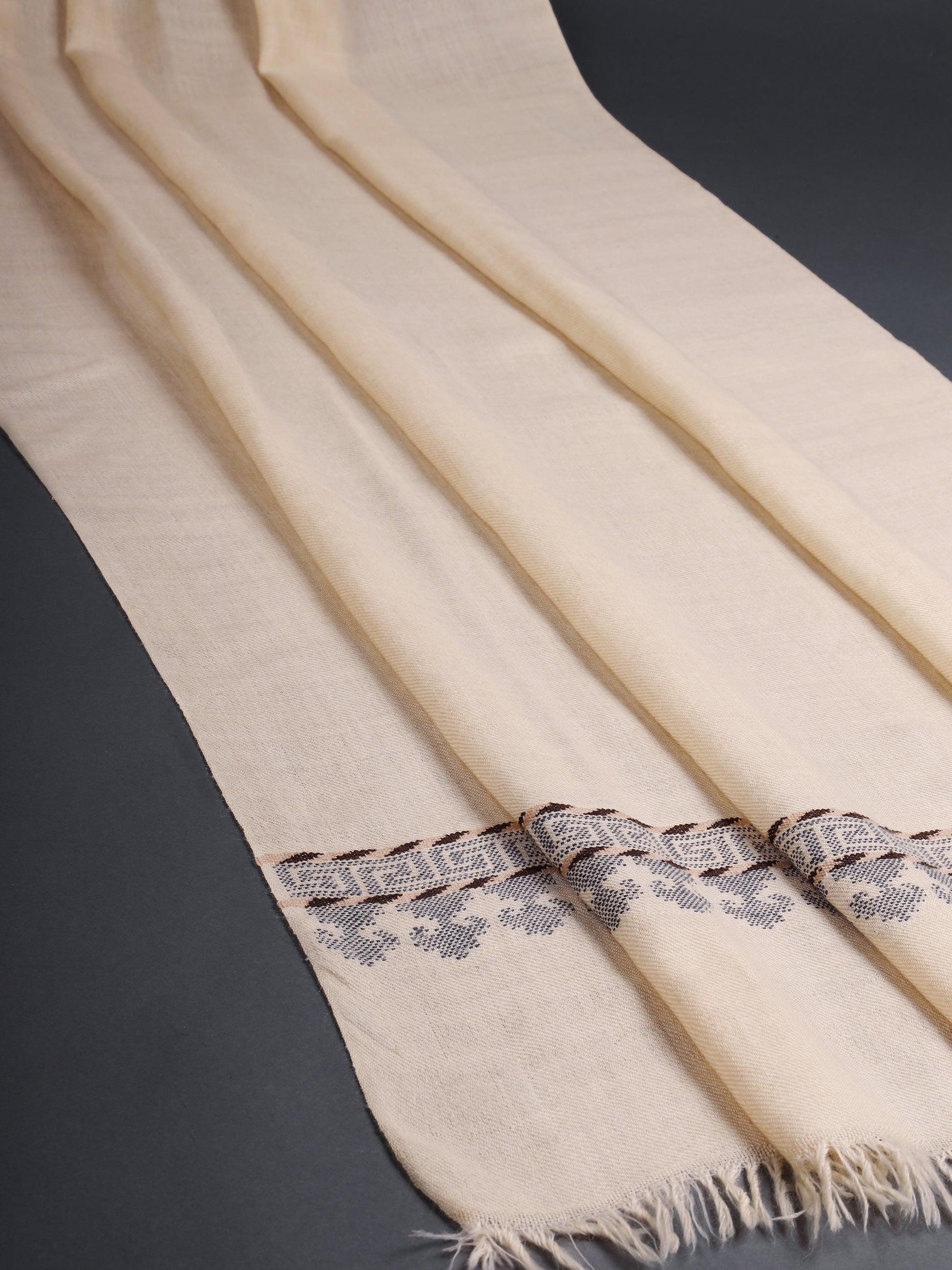 Handwoven Pashmina stole in natural white colour. The border design is inspired by traditional Ladakhi architectural pattern. It has been executed in an extra-weft Jamdani weave technique, and using yarns dyed in azo free, acid dyes.