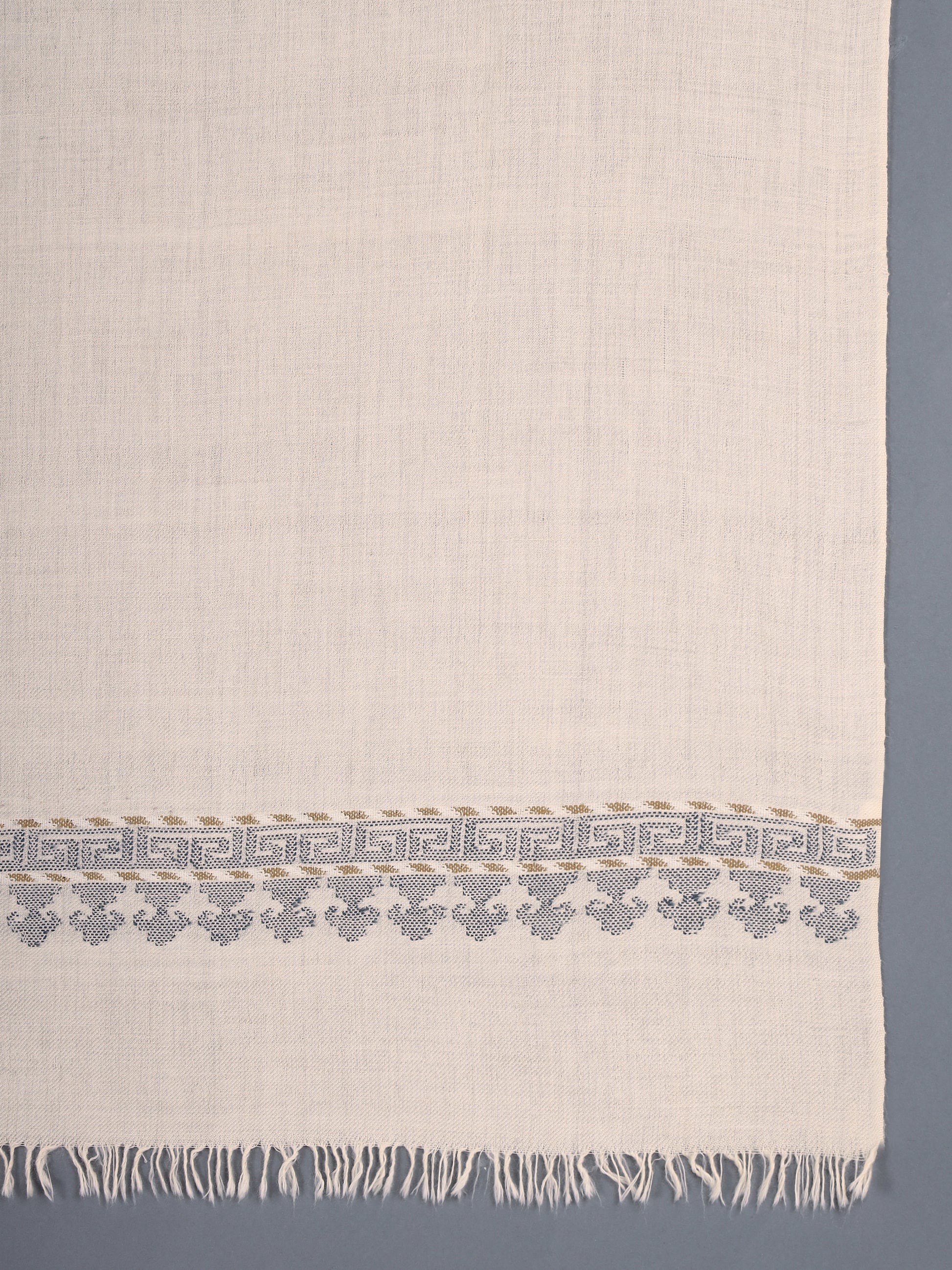 Handwoven Pashmina stole in natural white colour. The border design is inspired by traditional Ladakhi architectural pattern. It has been executed in an extra-weft Jamdani weave technique, and using yarns dyed in azo free, acid dyes.