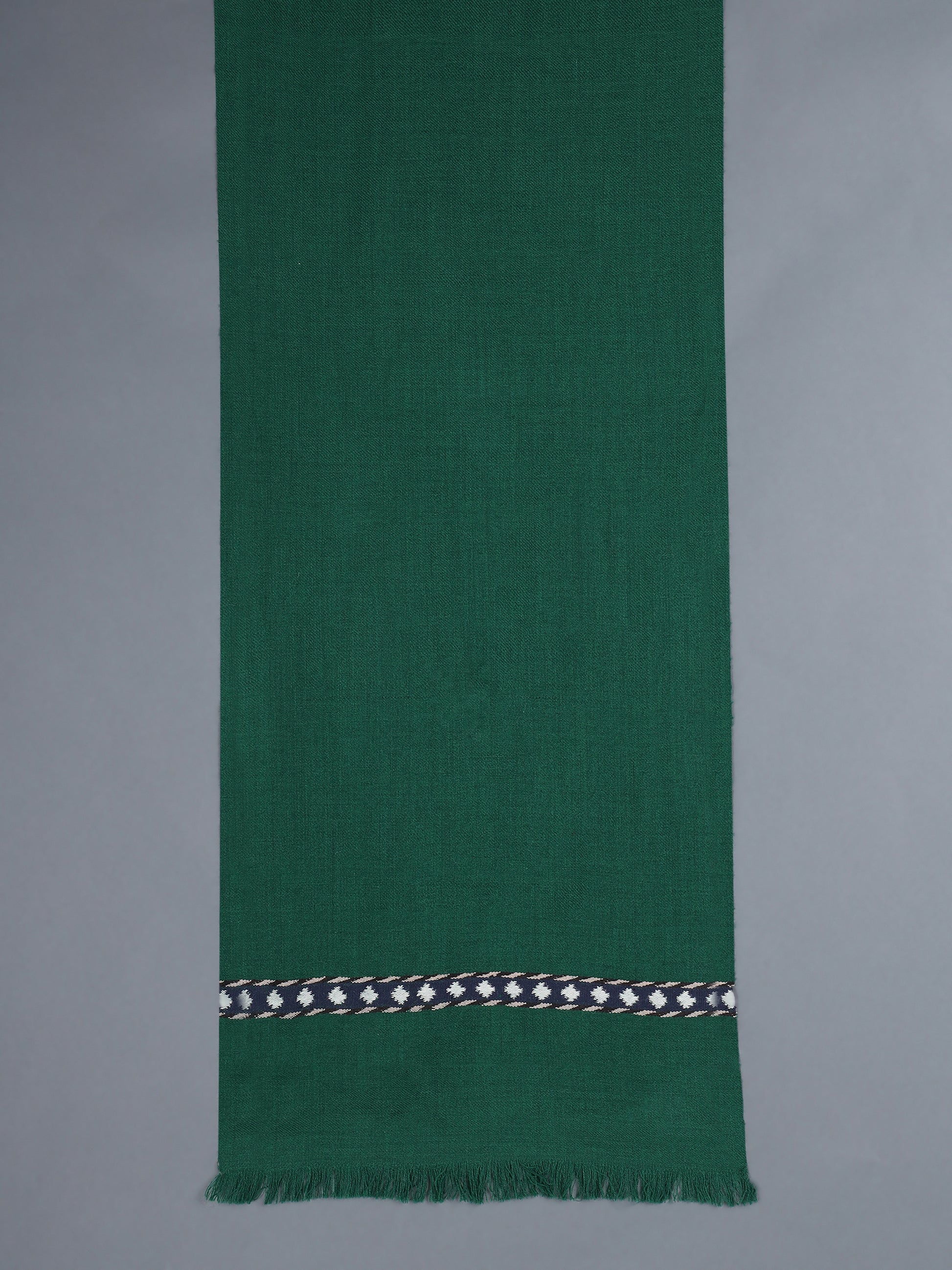 Handwoven, indigenous Himalayan wool scarf in peacock green colour (dyed using azo free, acid dyes). The border design is inspired by traditional Ladakhi architectural pattern. It has been executed in a plain tapestry weave technique, and using yarns dyed in azo free, acid dyes.