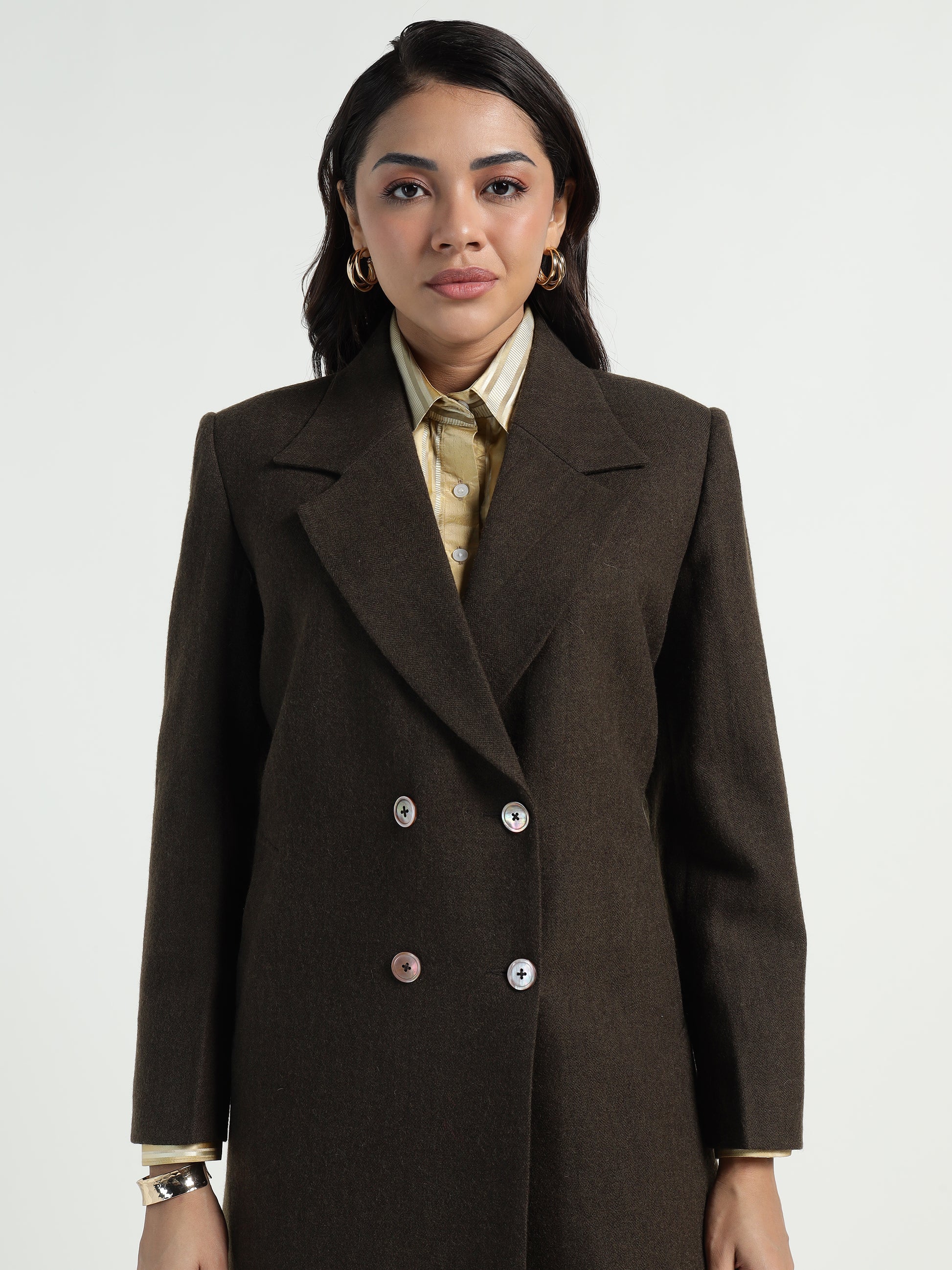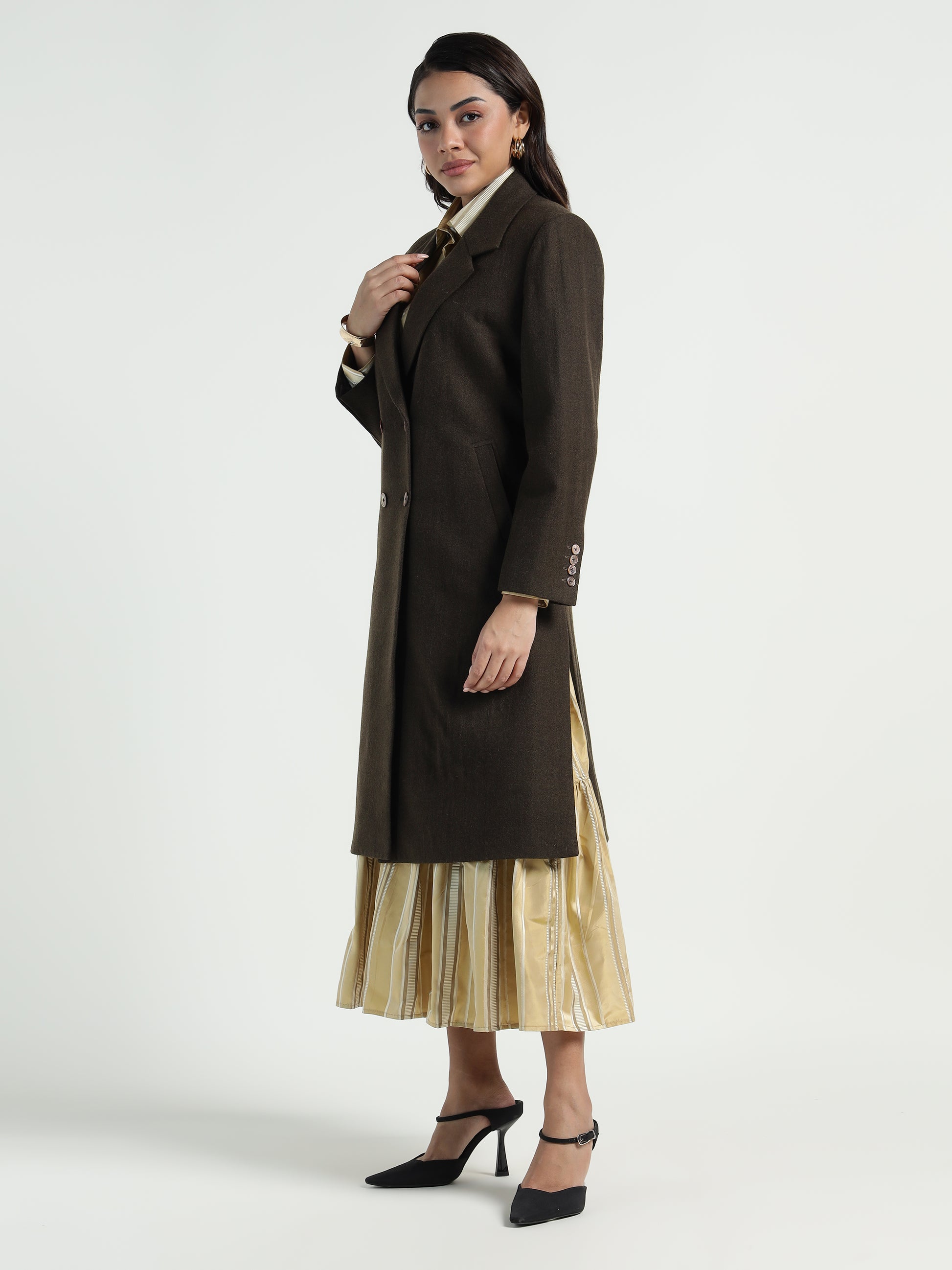 Classic long coat in 100% indigenous Himalayan sheep wool. The fabric is woven on a handloom with machine spun wool yarns in 2/2 twill weave. The yarns are dyed with Azo free synthetic dyes. The fabric has been milled.