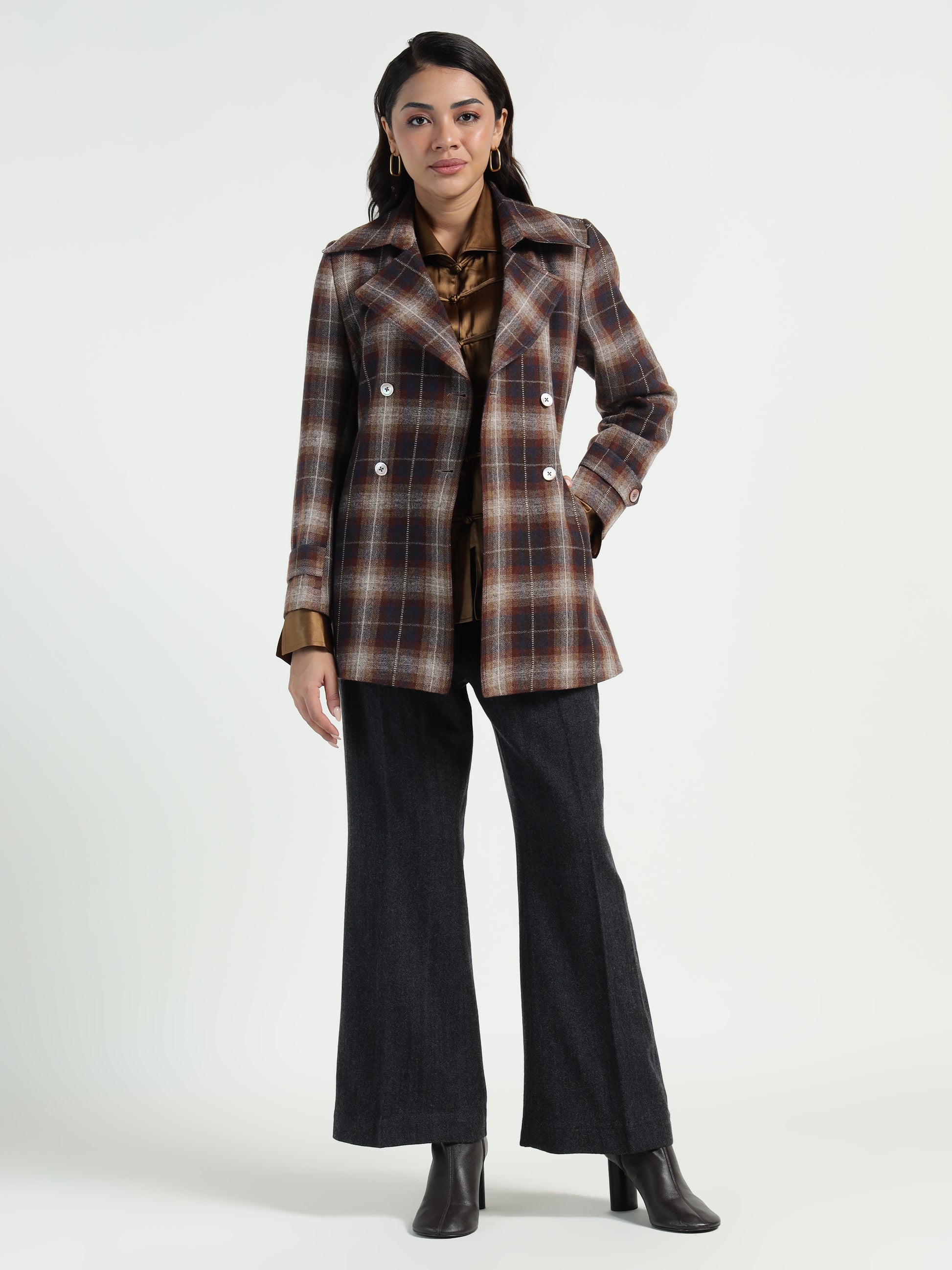 Cropped Trench Coat Ladakh Wool Brown Tartan
