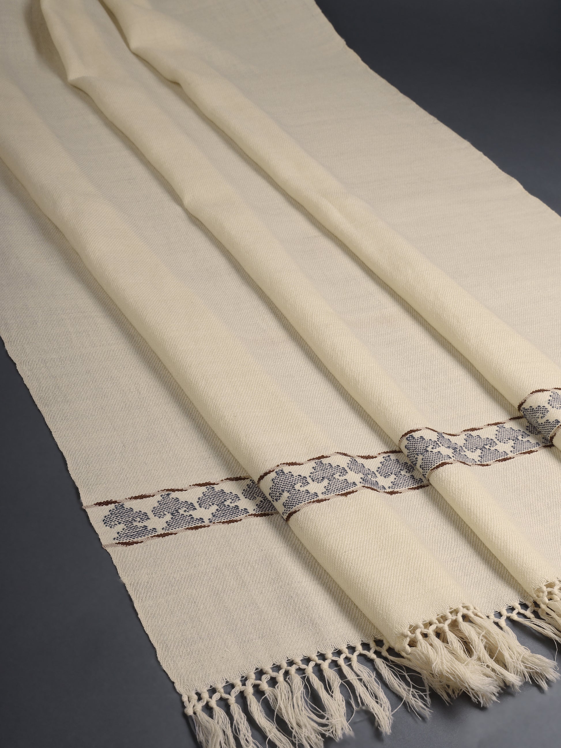 Handwoven, indigenous Himalayan wool stole in natural white colour. The border design is inspired by traditional Ladakhi architectural pattern. It has been executed in a extra-weft Jamdani weave technique, and using yarns dyed in azo free, acid dyes.