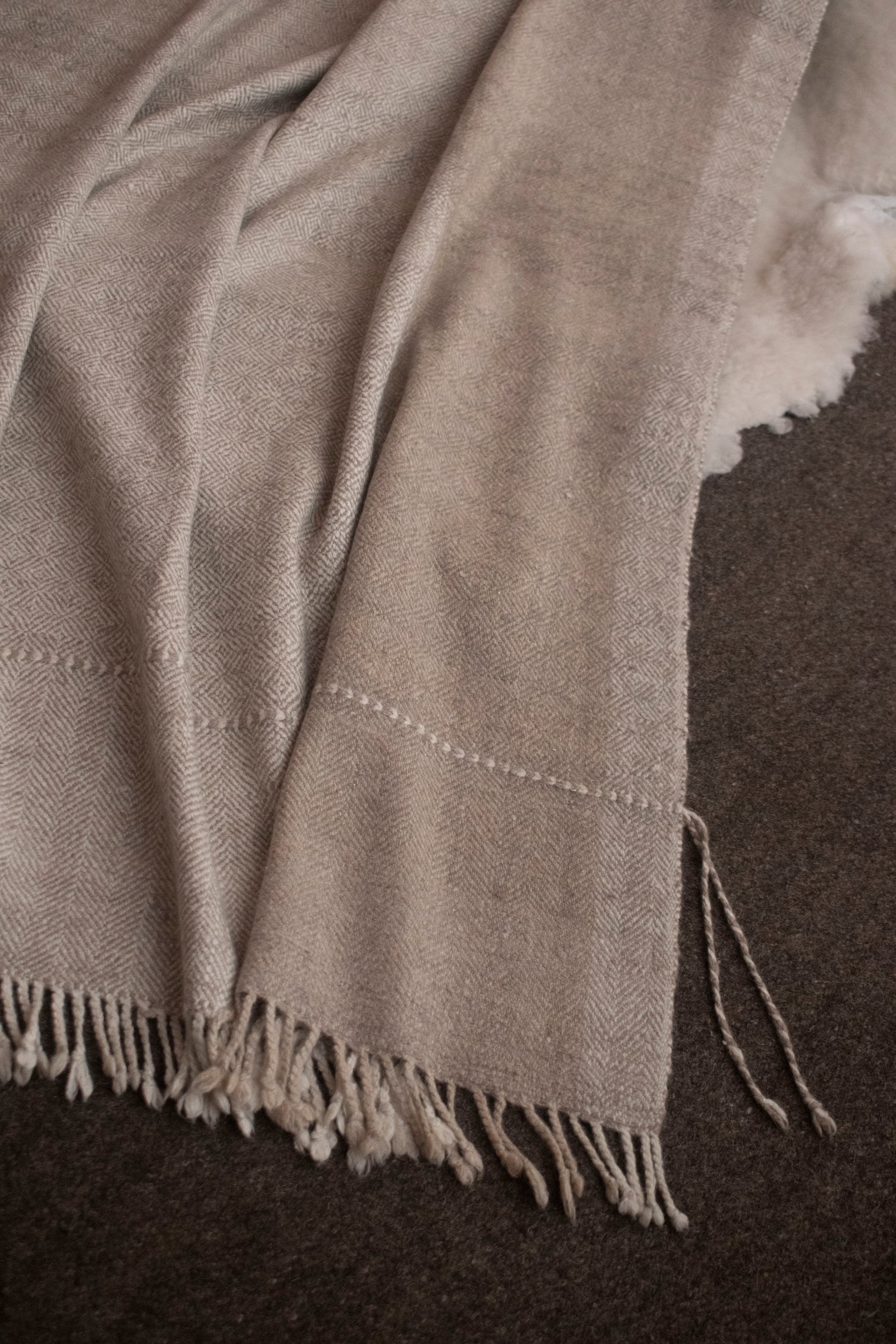 A classic, handspun, and handwoven Cashmere shawl in natural down hair colors of gray and white. It’s woven in a diamond weave – called Lugmik in Ladakhi, featuring our trademark braid detail inspired by the Ladakhi menswear belt called Skeraks.
